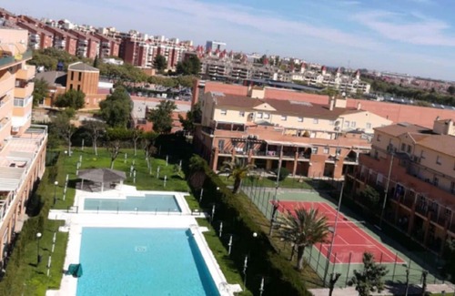 Two-bedroom apartment in a residential area next to a huge park (Infanta Elena), 5 minutes walk from the Exhibition and Congress, 10min drive from Airport and 3min walk way station RENFE. 5 minutes walk from the bus line 27 which communicates with the city center.(Plaza del Duque). Adult and child community pool available from mid June to mid September. It has two rooms with two double beds