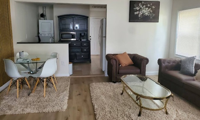 This studio apartment is set up for comfort and convenience, perfect for one or two people. Inside, the sleeping space has a queen bed, a nightstand dresser, and a built-in closet, along with a 55" TV for kicking back. The living area has a wooden floor, a comfy setup for relaxing, and a second TV that's 65 ". The kitchen is small but fully stocked, with a coffee machine, microwave, stove, fridge, and all the china you'll need. A dining table seats four if you want to sit down for a meal.