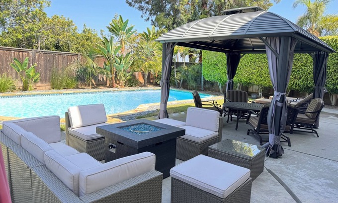 - Private Oasis: Enjoy a large backyard featuring a sparkling pool, cozy firepit, and a beautifully decorated gazebo, creating an enchanting atmosphere for pre-wedding gatherings and celebrations.