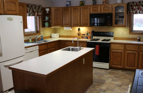 The second level of the house is a newly-finished upstairs loft apartment with a separate entrance and deck. This space has its own kitchen and full bathroom. The open floor plan includes a living space with a king-size bed and a small day bed, along with a comfortable futon that can be made up to accommodate larger groups. Baseboard heaters provide the space with plenty of heat, and the wood fire heat on the main floor also helps to keep the loft warm.