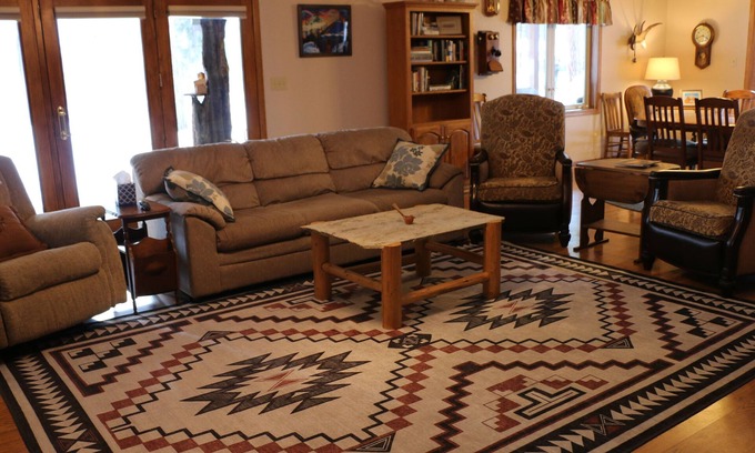 The house itself has a spacious and cozy main floor with open living space, radiant in-floor heat, and a wood stove. From the living room, french doors open out onto a back porch with a swinging chair overlooking a grove of Ponderosa Pines and the North Fork of the Salmon. A woodstove in the living space keeps the house warm and cozy, and we'll have kindling and wood stocked for your stay! The living room's abundant seating is great for group games, movies, and gathering around the fire in the evening. The kitchen is large - lots of counter space and an island with a second sink, making it easy to cook group meals. We love cooking and we've done our best to stock the kitchen with all the things you'll need during your trip, plus some! Two grills and a smoker are also available on the porch for cooking outside.