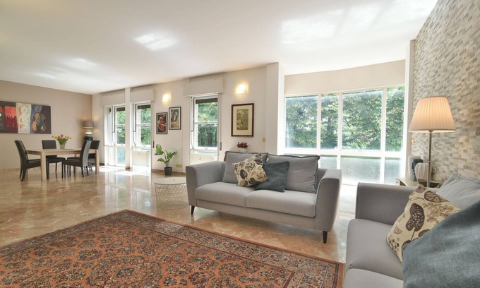 This is an elegant, spacious 140mq apartment with a beautiful and bright 60mq living room overlooking the trees in the avenue.