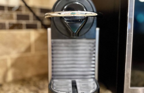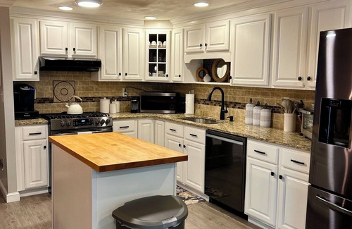 The spacious eat-in kitchen is well-stocked with spices and everything you need to cook on the gas stove along with a waffle maker, blender, toaster, dishes, utensils and serving dishes. There are also a stocked Keurig coffee machine and a stocked Nespresso machine as well as a fine selection of tea.