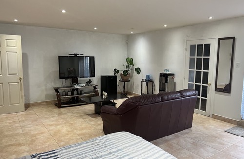 Really big space, easy access to the bathroom. Queen Sized Bed. Quiet Family living upstairs. Washer and Dryer is Shared. Smart Lock with Code