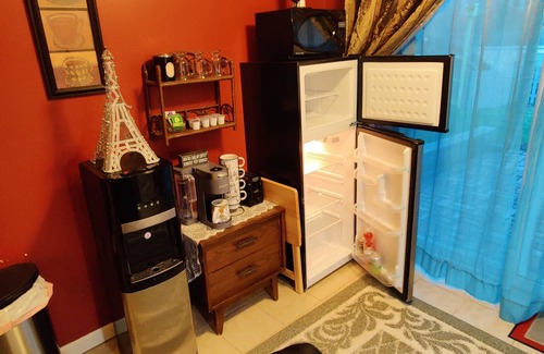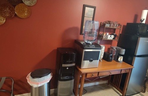The home has 1 dedicated full bathroom with shower, just for the guest so it's all yours. Your space comes with apartment size fridge, desktop computer, ice maker, hot/cold purified water cooler dispenser, coffee machine, toaster, microwave, massage chair, Amazon Alexa Smart Basement, 55 Inch Smart TV, and more.