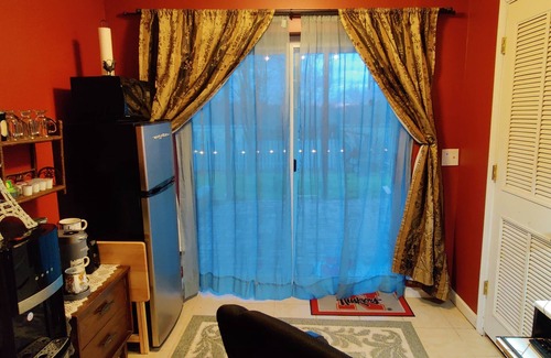Your place "400+ sq. ft." has a separate entrance from the backyard. We are a pet friendly as long as your pet is friendly and you clean up after them. We have 3 chickens, a cat and 1 child in the home.