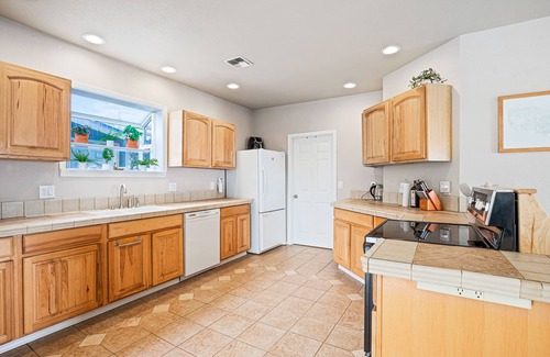 With four bedrooms, 3 full baths, and a den, there’s space to comfortably accommodate 12 people. The primary bedroom is on the second level and features a king bed, an ensuite bath, and a remote workstation. Each of the other bedrooms also has a king bed. There are two rollaway single beds to use as you wish. Sleep two more on the queen sleeper sofa in the den which has its own door for extra privacy. There is plenty of space for everyone to keep up with daily routines before hitting the trails or taking a trip to Lava Beds National Monument.