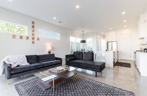 These are both brand new gorgeous townhomes with high-end finish outs that are close to everything in Dallas. Feel at home in this modern 6 bedroom 6 bathroom townhouse near downtown Dallas with 2 living room spaces, 2 large kitchens, 10ft ceilings, museum finish floating walls, pre-wired smart home with Alexa/nest, open living area and private bathroom attached to each bedroom. Smart TVs with streaming Netflix/Hulu and cable. Also a great balcony and view of the Dallas skyline.