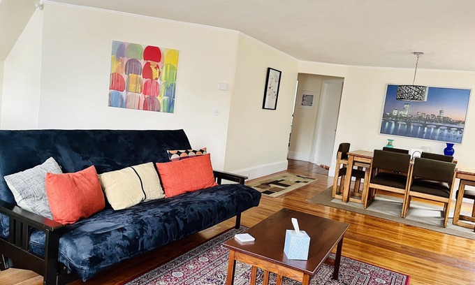 CONTACTLESS check in & out. 24/7 PARKING available. LOCATION is one of the best features of this environmentally friendly home! Always impeccably clean and located in a safe neighborhood near the Mystic River and only 5 miles northwest of downtown Boston (only a 6 min drive!). We have many of the amenities of home but, should you need specialty items, supermarkets, 24 hr. pharmacy and shopping is within walking distance (no need for a car) – as well as commuter trains and buses!