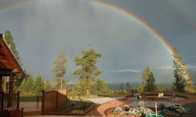 Jan 4th - Apr 23rd 30 night min. only $70 per night. Nestled in countryside of Kettle Falls, this delightful Lake and mountain view home offers a peaceful retreat for guests. Unique hand hewn pine interior in small original portion of home. 2 bedrooms including a king bed, queen bed, and futon, along with 2 full bathrooms , 0ne with a bathtub and shower, other with jet tub. This amazing property provides all the comforts of home. The living room with sofa bed. Whether you're looking to unwind or explore the area, this unique house is the perfect home base for your getaway. 10 min. to small town, 25 min to a larger town. 6 mi. to marina, 100 miles of boating Lake Roosevelt. Columbia River, 2 miles as a crow flies. Smaller Kettle River nearby. Miles and Miles of Forest area for horseback, ATV, snowmobiling, hunting or hiking all hop skip n jump away. 26 mi. from Canadian Border 1 hr from Lake Curlew. Small fishing lakes within the area. Beaches 5-25 min away. visit. the 2 mules on property. Contact host about property site entrance and surroundings prior to approaching house as the photos do not reflect the who;e property and photos were taken at prettiest time of year. There are other units on the property although the house is quite private and faces the landscaping, the rolling hills and the amazing lake only. Plenty of uncovered parking for toys. All my guests say to me is, " Amazing views and very accommodating! love the space! Disclosure. There is a friendly dog at Cabin 100- 200' away to the side of house but set back behind a ways. , and you may hear her bark occasionally or see her run about. Pics of house outside are from all angles, so you will recognize it when you drive up, as you come up to the backside of the house. all large view windows are in front and back is private w/ few small windows. Once at the house, all you pass is behind you, and all you can see is the Beautiful Lake, Landscaping, Rolling Green Hills.. Pics of inside to come. If they are not here, please ask for them. The home is fully and attractively furnished. Houseplants, Wood Stove and other other heat sources.wood included. Most all amenities in kitchen, bath and bedrooms that you might need. bbq, table and cusioned chairs on huge view deck w. lounge chair( seasonal. . PLEASE MESSAGE ME BEFORE BOOKING as I also have another vacation calandar that I have not synced yet with VRBO. DISCLOSURE. there are some cracked and missing tiles on front patios. But still very pleasant. These pics were taken 3 yrs ago in summer. Inside pics will be current. recommend front wheel drive w/ studs or 4 wheel. short distance on private drive. familiarity w/ wood stove recommended. wood provided. other heat sources available to supplement stove.