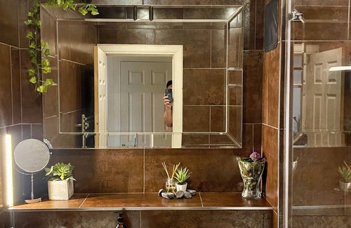 Bright and modern, with a full-size bathtub, electric shower, and a large mirror.