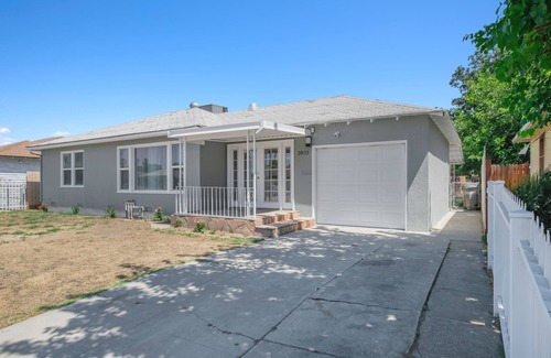 Upgraded 2 bed 1 bath, large living with dining area, all new appliances and furniture, 7 min to airport, great access (70 min) to national parks (Yosemite, Sequoia, Kings Canyon, etc), fenced front and back yards, 300 MB high speed wifi, hardwood flooring, 65" TV w. DIRECTV + Netflix, propane BBQ grill, all kitchen essentials including blender, coffee maker. 2 queen beds, 1 full-twin bunk bed and 1 queen sofa bed. 2 cars securely parked in a garage and on the driveway inside the gate fence