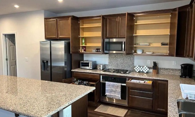 This beautiful home has 4 bedrooms - a Master Suite with a King size bed and a queen size air mattress and 3 bedrooms with queen size beds - and 3 full bathrooms. Guests will have access to a full kitchen, equipped with all your kitchen essentials. It is important for all guests to be aware that this house is in a new developing area, so expect construction. Guests will not be given access to the garage, but can park vehicles on the driveway or on the street.