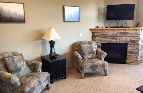The condo is designed for relaxation, with an open-concept layout, cozy gas fireplace, flat-screen TVs, and a fully equipped kitchen with full-size appliances—ideal for enjoying home-cooked meals after a day of adventure. Step outside onto your private balcony or patio and take in the fresh Northwoods air.