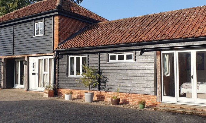 The Granary is set in the Suffolk countryside, 4 miles from Stradbroke which has a shop, bakery, two pubs and a post office. The property has it's own courtyard to park in and a hedge enclosed rear garden. The property is set over two floors with two easy access downstairs bedrooms and a large master bedroom upstairs. The Stag Room has an en-suite walk-in shower and patio doors to the courtyard. The Bunny room has the main bathroom next to it with another walk-in shower, in addition to a large bath. The Master suite has a large bath to relax in with a shower attachment if needed. There is a kitchen diner and a comfortable lounge with wood burning stove to one end. Beyond the enclosed garden there is a large field that can be used to run around in, play games, fly a kit or watch the sky. In addition there is some outdoor play equipment and a tree swing for children to use. Children must not be left unattended. The kitchen is fully equipped with a fridge freezer and an additional small fridge. There is a dishwasher, hob, built in oven and washing machine, (clothes horse for drying). Some coffee pods are provided for the Nespresso Vertuo, (bring your favourites if you prefer). Please note, there is a pond in the grounds of Red House Farm that is not fenced. Other things to note: Wheelchair Access is possible with access via a ramp to the French doors of the kitchen. However, please note the doorway between the kitchen and living room is 78cm and the door through to the bedrooms is 74cm wide. There is room to manoeuvre a regular wheelchair around the Stag bedroom. There is a lip of about 3.5cm to step over into the walk-in showers. There are various farm buildings used for our business which involves some wood sawing. Any noise is kept to a minimum and carried out when guests are out for the day. Please feel to get in contact for any specific requirements. There is plenty of room to park 3 cars in the enclosed courtyard gated area.