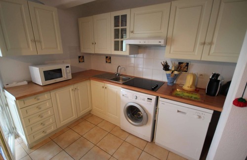 Located in the Residence "Le Clos de Socorro", with communal swimming pool (june to sept), about 1000m to the sea. This is a lovely spacious house with a view of the nature reserve, airconditioning, there is a spacious living room and well fitted kitchen, 1 bedroom with a double bed downstairs and a new shower room with toilet. Upstairs 2 bedrooms, one twin and bunker beds which leads on to the balcony, shower room with toilet, one parking space, converstory with tiled corner terrace with hedges. Wifi access. This is an ideal family villa with plenty of space inside and out. - Final cleaning included. NO PETS