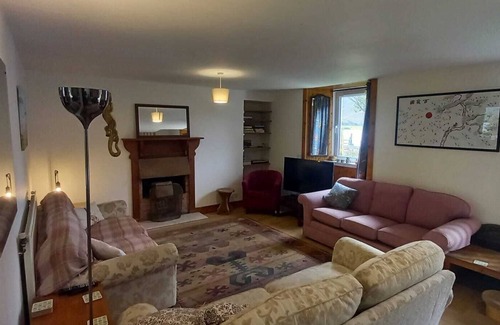 Large living room with three sofas and armchair and an open fireplace. Plenty of books, games, puzzles and DVDs to keep you occupied on rainy days!
