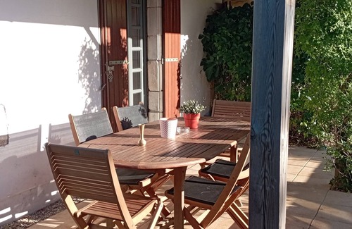 Sur votre terrasse ombragée, vous trouverez un salon de jardin en bois pour 8 personnes et un barbecue au gaz donnant sur le vaste jardin et la très grande piscine partagée et sécurisée avec les deux autres gîtes de la propriété.