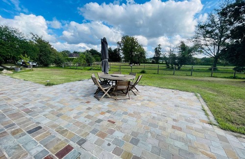 Private terrace. Garden furniture. Owners' dogs on site and likely to come onto the terrace of the gîte.