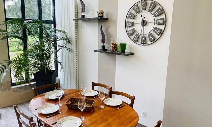 In the grounds of a large property, gîte set up in a beautiful outbuilding, very bright and spacious. All on the ground floor at your disposal, kitchen/living room/dining room. 1 large bedroom for 3 people. 1 double bed and 2 single beds and 1 bedroom for 2 people with 2 beds 90. 1 bathroom with large Italian shower, sink and toilet.