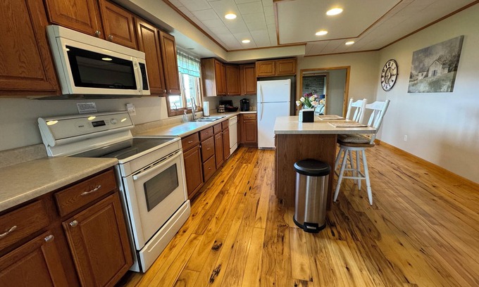 This ranch home includes a dining area, seating at the kitchen island, and a fully stocked kitchen with a full size refrigerator/freezer, stove, microwave, toaster, and Kerig coffee maker. The living room offers a pellet stove to get extra cozy in the winter months and enough seating for everyone to gather. Relax in the bedrooms and enjoy the canvas displays of nearby natural landscapes.