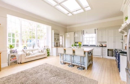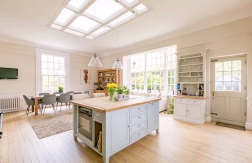 The fully equipped kitchen boasts an Aga stove (an electric oven is also available), with a large centre island and plenty of space for entertaining. There is a large dining table with seating for 10 (with additional seating at the kitchen island). There is a sofa so you can relax with views of the garden in the bay window.