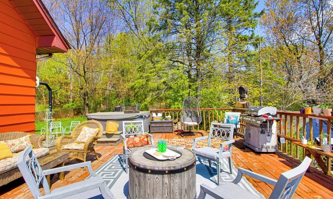 OUTDOOR LIVING: Large deck w/ outdoor seating, 3 outdoor grills (bring your own charcoal, propane not provided), gas fire table, hot tub, wood-burning fire pit, basketball hoop