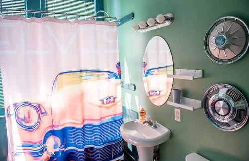 Located in the eclectic Bywater neighborhood, The Lookout Inn is an owner-occupied inn with four whimsically themed and private spacious suites. The colorful ELVIS suite is complete with a queen sized bed, adjacent living room area, and generous private bathroom. This suite is on the second floor of the inn, accessible by stairs.