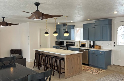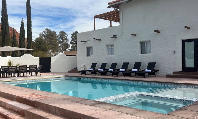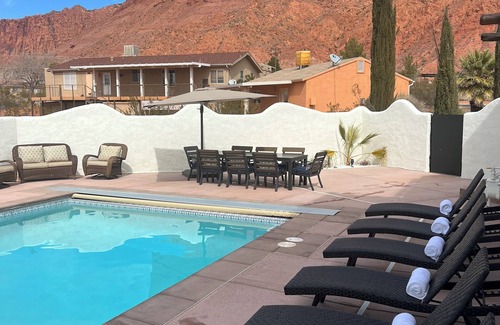 Spacious estate with unique 3 separate living areas. This enchanting estate boasts 3 king beds, 2 bunk beds, and 8 queen beds, perfect for large groups or families. Estate has close to 1 acre of property with a unique Spanish style decor. The home was recently completely remodeled from inside out. 2 outdoor upper decks to enjoy with fire pits and sitting areas! Private pool and jacuzzi heated for enjoyment! 2 more fire pits close in range around pool area. The home is fully stocked with everything you need to enjoy your stay. Ivins is a very quiet, beautiful, kept secret away from the craziness of the city life! Come see why this place is magical. Fall in love with Ivins and enjoy the magic it has to offer.