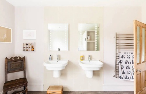 On the first floor there is a large luxurious bathroom, with bath and separate walk-in shower. Moving upstairs there are three generous bedrooms. The large master bedroom offers a Super King bed, south-facing bay window and ample storage for guests. The second bedroom has a King size bed, a double wardrobe, and views out to the garden. The third bedroom contains a double bed.