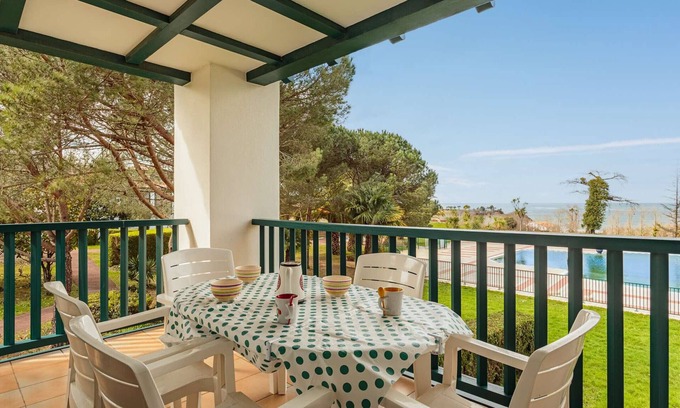 This property is located on the 1st floor without elevator of a tourist residence with a view of a superb communal swimming pool, green spaces and a splendid view of the Atlantic.