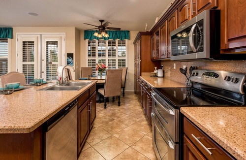 Kick off your shoes and relax at this five bedroom, family-friendly home complete with an oasis back yard and deluxe amenities from top to bottom. Inside, visiting chefs will fall in love with the glorious open kitchen with stainless steel appliances, a double oven range, a breakfast bar, and a casual table for four, while more formal meals can be enjoyed in the dining room furnished with a table for six. There are two separate living areas with wall-mounted flatscreen TVs and comfortable seating options, while those craving a little friendly competition are sure to have a great time in the game room complete with a dart board and a full-size pool table. Outside, you'll find a resort-style yard with a heated, PebbleTec pool and an outdoor kitchen with counter seating and a gas grill. And for sleeping arrangements, this home offers a king-size bedroom on the lower level, and four more bedrooms upstairs including three with comfortable queen-size beds and a kid-friendly room with two side-by-side twins.