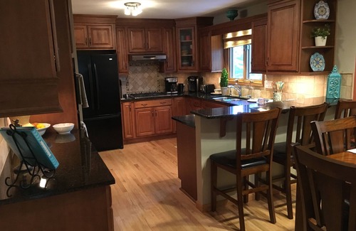 The kitchen features beautiful granite counter tops, tile and hardwood finishes, overhead and under cabinet lighting. Our kitchen nook and dining room seat a total of 16 + 2 high chairs and on the warm summer days the patio seats16. It is perfect for your large family gatherings. There are additional folding tables with chairs and a table in the game room with 6 more chairs. So there is plenty of room for everyone.