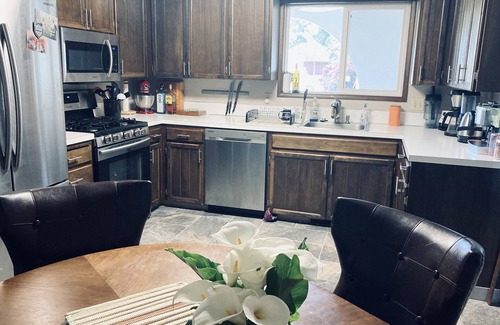 Full home perfect for families and groups. We are pet friendly with a large backyard, so you can bring your furry loved ones! We have a hot tub, 3 king-sized beds and a queen-size air mattress. The kitchen appliances and laundry machines are modern and guests are welcome to use. The kitchen has everything you need to prep amazing family meals. There is a large driveway that can comfortably park 3+ cars. The entire home is on a single level. It's easy to feel at home here!
