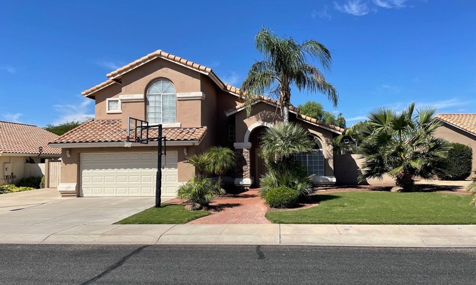 Short, easy 15 minute drive to State Farm Stadium or Waste Management Open! Gorgeous private backyard with pool, fire pit, covered patio, wood pellet grill and outdoor dining seating. Inside is clean, spacicous and well appointed with plenty to entertain everyone including ping pong table, darts, outdoor basketball hoop (driveway). Fast wireless internet and Apple TV for all your electronic desires. Enjoy Arizona living at its finest!