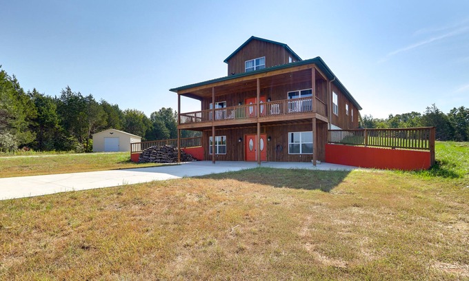 Experience an unforgettable stay at this expansive 5-bedroom, 3-bathroom vacation rental in Luebbering. Ideal for large families or groups, this multi-level home boasts 2 kitchens and 2 living rooms, ensuring everyone has plenty of space to unwind. Fish or hunt deer, turkey, and geese on-site, explore nearby ATV trails, or gather around the fire pit in the evenings. Take in the breathtaking views of the surrounding pond and natural beauty, then venture to Meramec State Park for more outdoor fun!