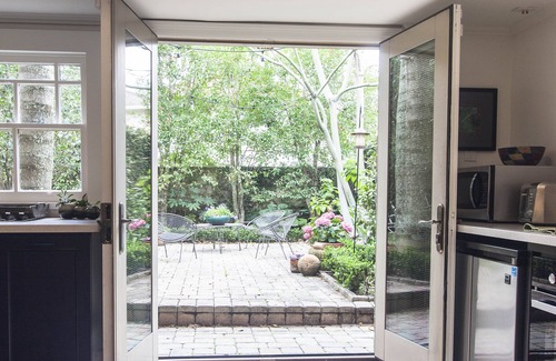 Our one bedroom apartment features 1 king sized bed and a day bed with trundle. It also has a full kitchen. Enjoy your morning coffee through the French doors in our professionally landscaped garden.
