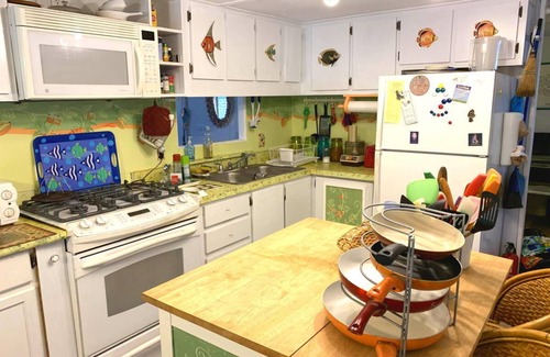 Seagrape Escape began life in 1970 as a 12' x 46' 2 bedroom 1 bath single-wide mobile home. Over the years (in traditional Florida fashion) it gained a spacious living room, a third bedroom. and a large lanai. I've had fun doing seat-of-the-pants remodeling since I bought it, but at its heart it is an older home. It is comfortable and sweet, but it is not child-proof. I'm still in the process of adding art and upgrading the trim.