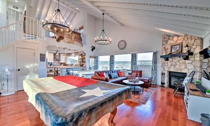 Featuring a bar, Spacious Getaway about 12 Acres, Views, and Hot Tub! features accommodations in Strawn. This vacation home offers air-conditioned accommodations with free Wifi. Offering a balcony and lake views, the spacious vacation home includes 5 bedrooms, a living room, cable flat-screen TV, an equipped kitchen, and 3 bathrooms with a hot tub and a bath. Towels and bed linen are featured in the vacation home. The accommodation has a fireplace.