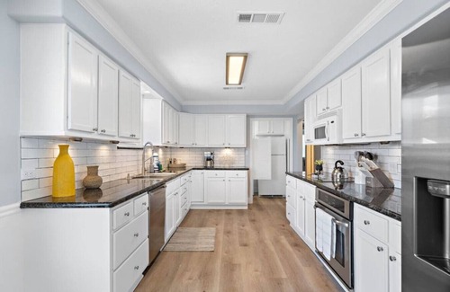 Unwind in style at The Good Life! This expansive Galveston escape boasts a main house (7 bedrooms, 4 full bathrooms, 2 half bathrooms) & a guest house (1 bedroom, 1 bathroom with a full-size kitchen), ideal for families, friends, and groups! Make a splash in the private Cowboy pool, soak up the sun on the deck, or stroll to the beach (less than 5 min drive!). Explore nearby Moody Gardens & Schlitterbahn (8 min away) and create lasting memories at The Good Life!