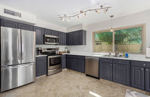 The sweetest spot in the Phoenix area! This memorable house is the perfect home base for your trip to Glendale. With 5 bedrooms including 2 king beds, 1 queen bed, 2 sets of bunk beds, and 1 sofa bed, there is plenty of space for all guests. The Bellair Golf Course is public, w/ a Toptracer driving range (think Top Golf) and a food truck, with cocktails and goodies, making it fun for the whole family! This is a two story home, but there is a stair lift for those that struggle with stairs. Located minutes from Spring Training fields, the Cardinals Stadium, great shopping and restaurants, hiking trails, pickle ball courts, and so much more! This beautiful home is fully stocked, and designed for style, comfort and fun!
