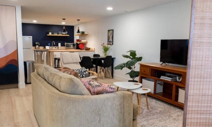 Our bright, newly renovated basement suite is perfectly located between Denver, Boulder, and the I-70 corridor! The suite is divided into one bedroom, a kitchen, and a studio bedroom/living room. We provide many amenities for a comfortable stay, including a private work space, a TV, a washer/dryer, and a patio table.