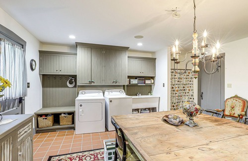 Soak up the serenity of the countryside when you stay at this inviting 4-bedroom, 4-bath vacation rental in New Haven, Missouri. Built in the 1850s and boasting 6,000 square feet of living space, this historic log cabin is perfect for getaways with friends, family, and pets. Visit the on-site pond, cast a line from the dock, go for a refreshing swim, or glide along the water using the provided canoes. After exploring the Meramec Caverns, return in the evening for a cookout on the patio!