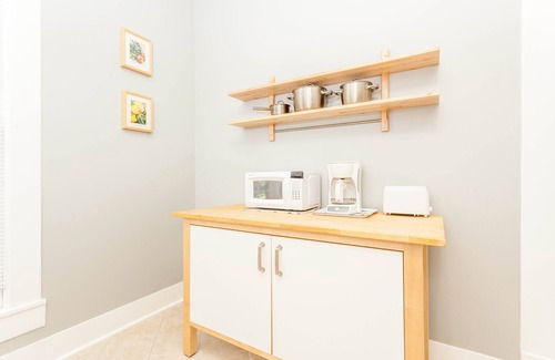 This charming light-filled Hyde Park bungalow features 10 foot ceilings with the original wood bead board, beautiful floors, the original clawfoot tub with a full shower, a queen bed in the main bedroom, a daybed and office space in the second bedroom, a full kitchen, fresh sheets and towels, and even free laundry. This historic home was completely remodeled, includes three completely separate residences, but still has its old character and charm from 1915 and is rich in history.