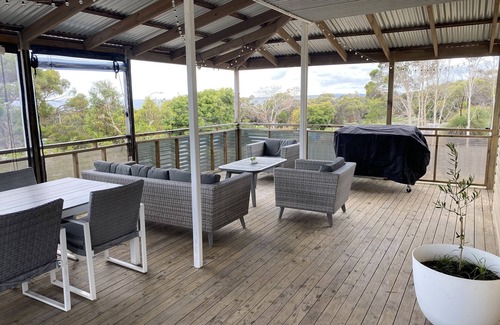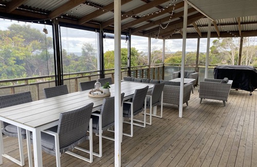 This two storey holiday house sleeps 9, has an upstairs balcony and a large deck which provides plenty of room to entertain and have a bbq, all year round.