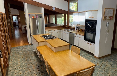 Well-Equipped Kitchen: The spacious kitchen is designed for large gatherings, featuring multiple cooking appliances, ample dining space, and outdoor patios perfect for hosting casual meals or gatherings.