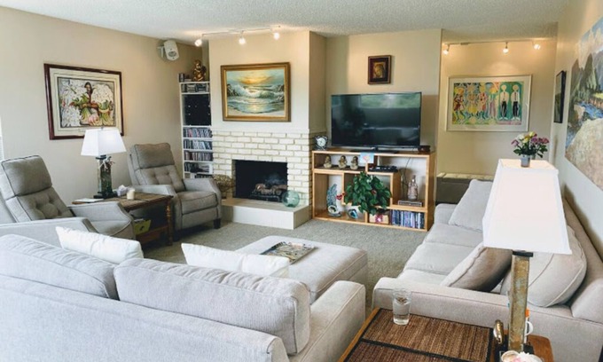 Spacious, ocean views, 1.5 miles up from the Beach! Pamper yourself in this pristine 1800 sq ft renovated home. 2 bedrooms, 1 bath, stocked kitchen, purified drinking water. Thoughtful amenities include fast internet, fireplaces, deep soaking tub, bidet toilet, air purifiers, new comfie beds. Beautiful gardens, outdoor dining deck w BBQ, patio with hot tub. Safe neighborhood up on the hill in Seaside next to a park in a peaceful cul-de-sac with driveway parking. Convenient to Everything.