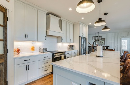 Your ultimate retreat awaits at this modern vacation rental in Clarkson, Kentucky! Boasting 7 bedrooms, 4.5 bathrooms, and 5,300 square feet, this vacation rental offers plenty of space for family and friends. Going out? Enjoy a scenic hike or take advantage of the pickleball courts at Paradise Grove Nolin Lake. When evening falls, watch a show in one of the 2 living rooms or by the deck's fireplace.