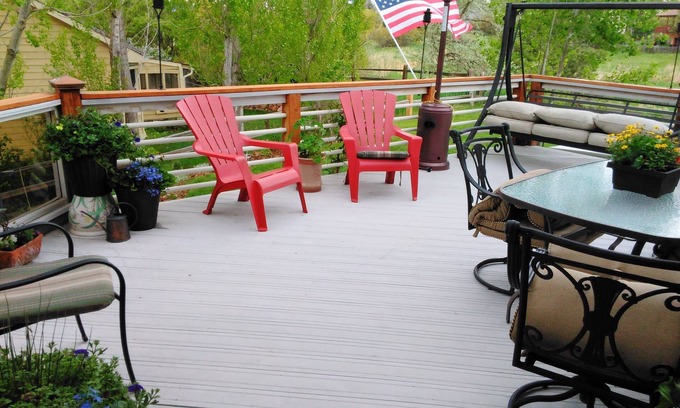 There is a large, furnished deck with a view of Pikes Peak to have dinner and relax after a day of sightseeing.