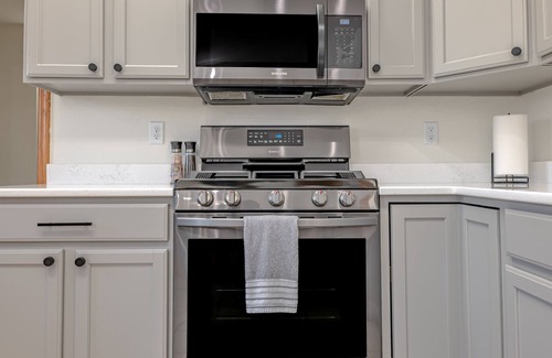 Bedroom one and bedroom two share the nearby bathroom which has a shower/bathtub, toilet, and sink/vanity. Bedroom one has a Queen-sized bed and fairly large closet. Bedroom two has 2 Twin over Full bunk beds to comfortably sleep up to 6 guests.